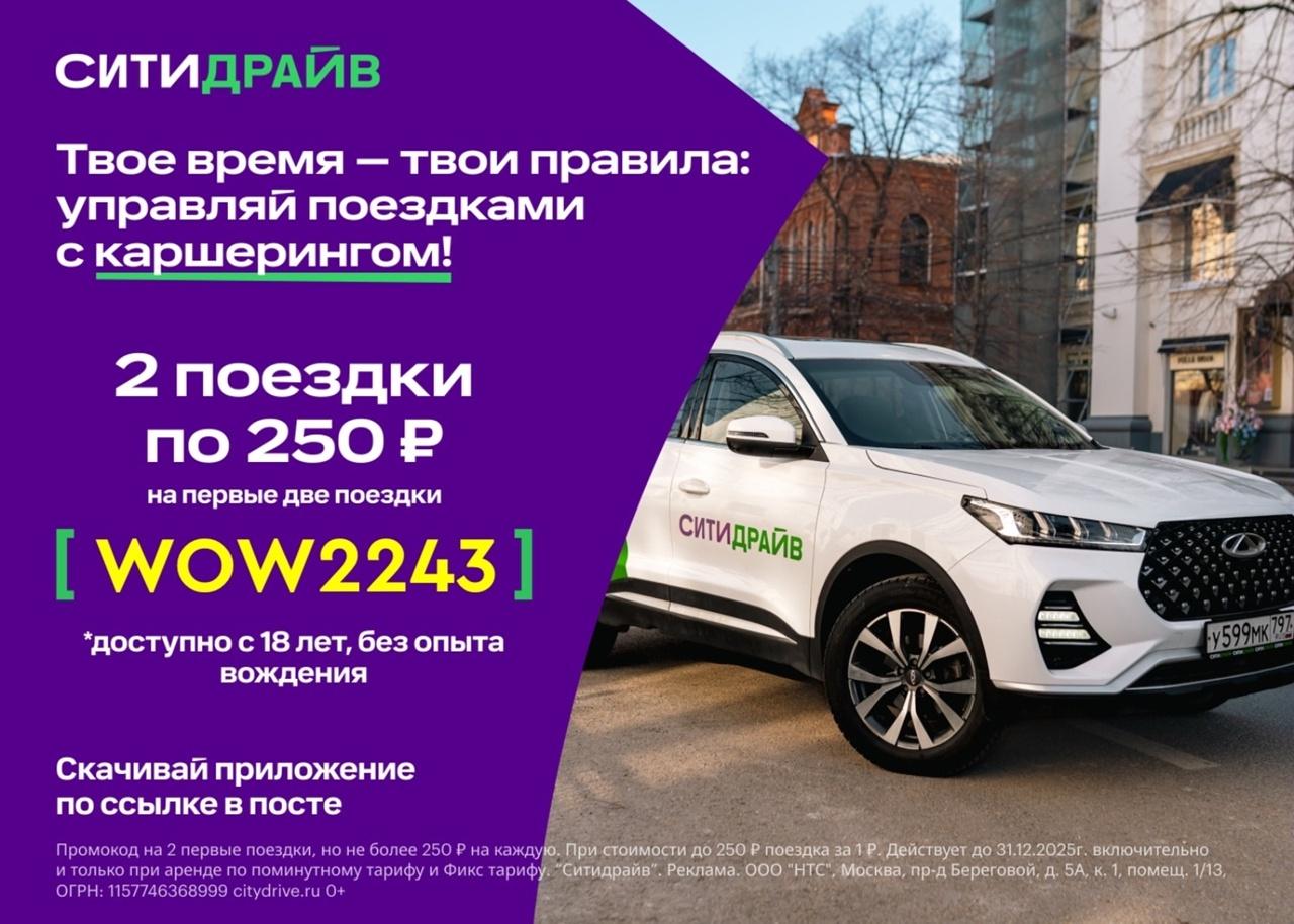 Промокод на 2 первые поездки, но не более 250 ₽ на каждую. При стоимости до 250 ₽ поездка за 1 ₽. Действует до 31.12.2025 г. вкл. при аренде по поминутному и Фикс тарифу.